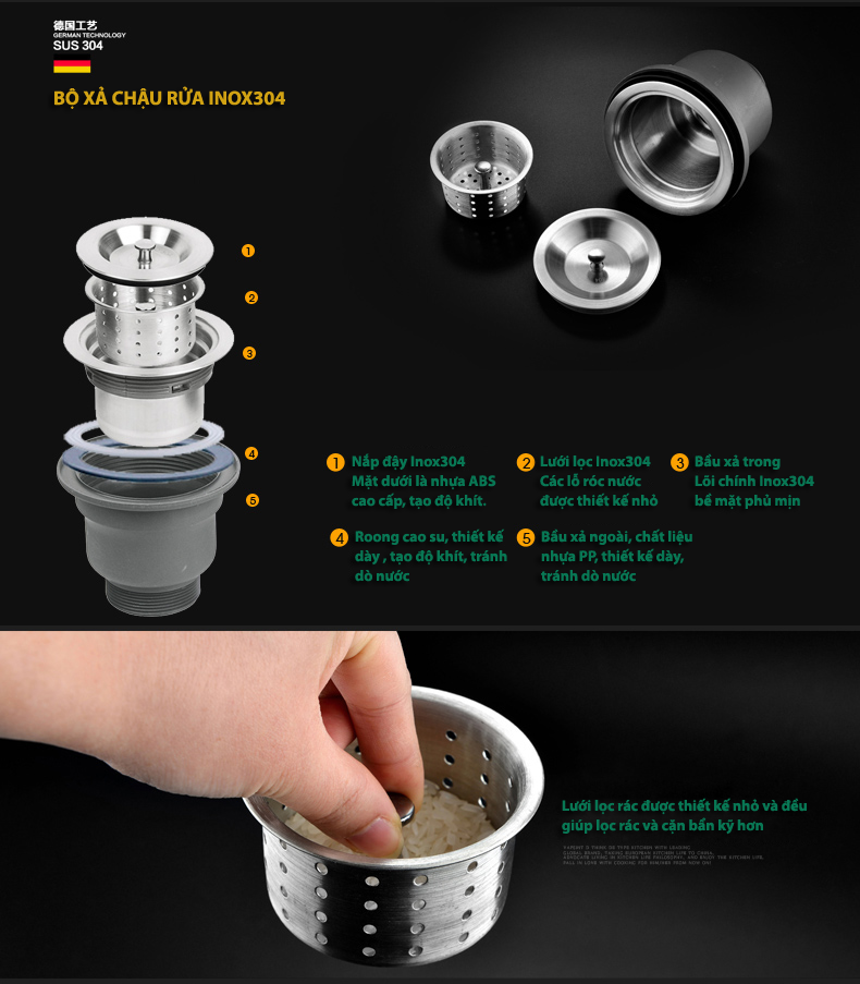 - Chất liệu: INOX SUS 304 cao cấp. - Độ dày: từ 0,8 ~ 1.2mm. - Công nghệ: Sử dụng công nghệ tiên tiến của ĐỨC SIL VINOX - Phủ Inox sợi mịn hoàn hảo, chống ăn mòn, chống bám dầu, dễ rửa sạch. - Bề mặt phủ: 3 lớp - Thiết kế 2 hố, đáy sâu, chiều ngang rộng chứa được nhiều vật dụng và sử dụng đa năng - Mỗi bên chậu được gia cố thêm miếng đệm cao su dày 3mm dùng để cách âm. - Bề mặt lòng chậu được thiết kế với 4 rãnh giúp xả nước nhanh hơn và sạch sẽ hơn so với chậu thông thường. - Vòi rửa bát đa năng, kéo dài, tắt mở nước bằng nút bấm - Kèm theo chậu rửa hoa quả nhỏ - riêng biệt với 2 bồn rửa - giữ gìn vệ sinh an toàn thực phẩm |