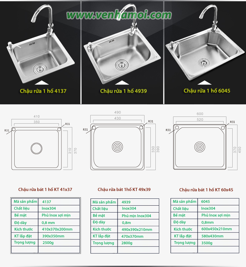 - Chậu được chia làm 07 loại: tùy thuộc vào kích thước và kèm vòi rửa bát. + Loại 4137: Kích thước 41x37cm, trọn bộ 6 phụ kiện, không kèm vòi rửa bát + Loại 4137: Kích thước 41x37cm, trọn bộ 9 phụ kiện, Kèm vòi rửa bát VNM-VQY002 (kiểu cao) + Loại 4939: Kích thước 49x39cm, trọn bộ 6 phụ kiện, Không kèm vòi rửa bát + Loại 4939: Kích thước 49x39cm, trọn bộ 9 phụ kiện, Kèm vòi rửa bát VNM-VQY003 (kiểu cao) + Loại 6045: Kích thước 60x45cm, trọn bộ 6 phụ kiện, Không kèm vòi rửa + Loại 6045: Kích thước 60x45cm, trọn bộ 9 phụ kiện, Kèm vòi rửa bát VNM-VQY002 (kiểu cao) + Loại 6045: Kích thước 60x45cm, trọn bộ 9 phụ kiện, Kèm vòi rửa bát kéo dài VNM-VYF006 (kiểu thấp)