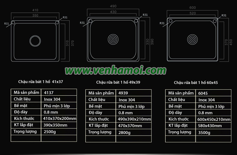 - Chậu được chia làm 03 loại: tùy thuộc vào kích thước + Loại 4137: Kích thước 41x37cm, kèm vòi rửa lõi đồng xoay 360 đa năng. + Loại 4939: Kích thước 49x39cm, kèm vòi rửa lõi đồng xoay 360 đa năng. + Loại 6045: Kích thước 60x45cm, kèm vòi rửa lõi đồng xoay 360 đa năng. |