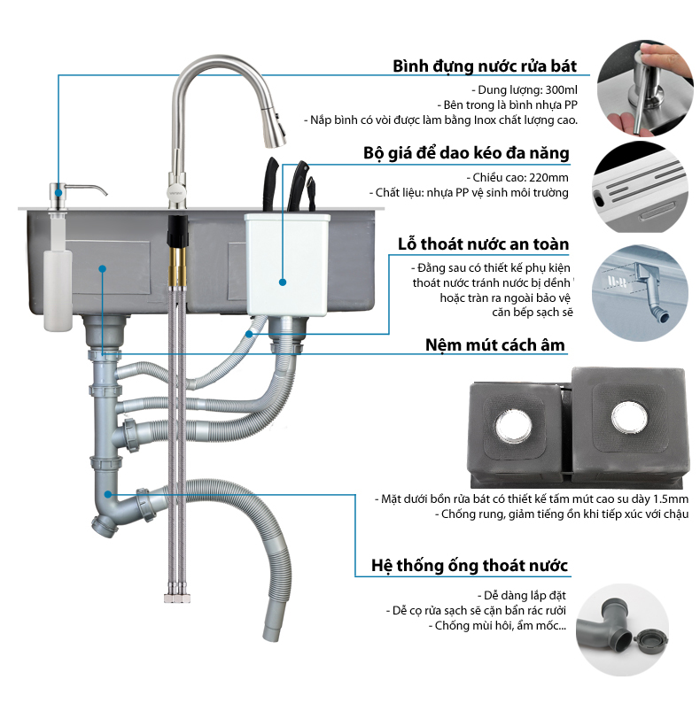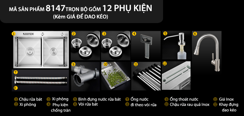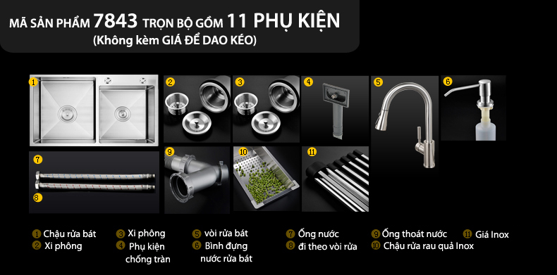 - Chậu được chia làm 04 loại: tùy thuộc vào kích thước và phụ kiện đi kèm. - Các đặc điểm khác nhau: + Loại 7843: Kích thước 78x43cm, trọn bộ 8 phụ kiện, KHÔNG kèm vòi rửa bát, KHÔNG kèm giá dao kéo . + Loại 7843: Kích thước 78x43cm, trọn bộ 11 phụ kiện, KÈM vòi rửa bát, KHÔNG kèm giá đựng dao kéo. + Loại 8147: Kích thước 81x47cm, trọn bộ 9 phụ kiện, KHÔNG kèm vòi rửa bát, KÈM giá đựng dao kéo. + Loại 8147: Kích thước 81x47cm, trọn bộ 12 phụ kiện, KÈM vòi rửa bát, KÈM giá đựng dao kéo. - VÒI RỬA BÁT kèm theo chậulà model: VNM-VQY016 (Click xem thông tin chi tiết) |