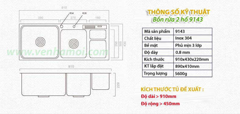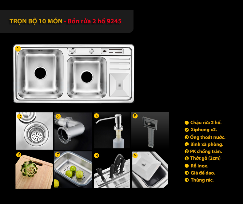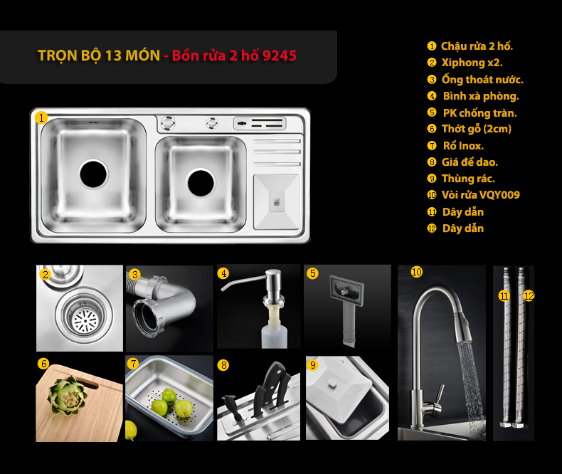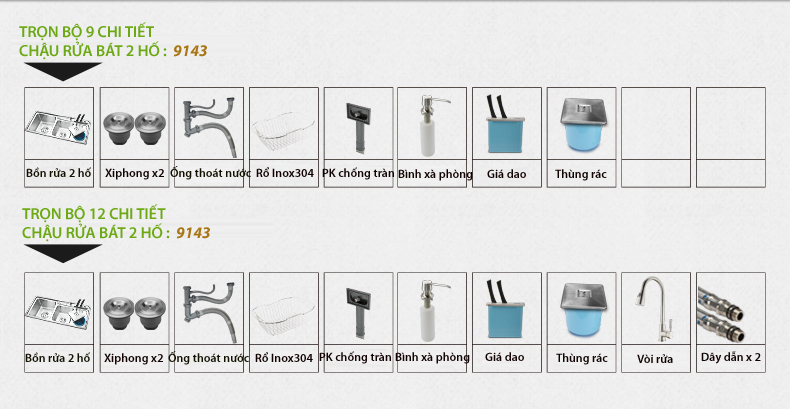 - Chậu được chia làm 04 loại: tùy thuộc vào kích thước và kèm vòi rửa bát. - Các đặc điểm khác nhau: + Loại 9143: Kích thước 91x43cm, trọn bộ 9 phụ kiện, KHÔNG kèm vòi rửa. + Loại 9143: Kích thước 91x43cm, trọn bộ 12 phụ kiện, kèm vòi rửa bát đa năng kéo dài. + Loại 9245: Kích thước 92x45cm, trọn bộ 10 phụ kiện, KHÔNG kèm vòi rửa. + Loại 9245: Kích thước 92x45cm, trọn bộ 13 phụ kiện, kèm vòi rửa bát đa năng kéo dài. - Vòi rửa bát kèm theo trong sản phẩm này có model: VNM-VQY009 (Click xem thông tin chi tiết) |