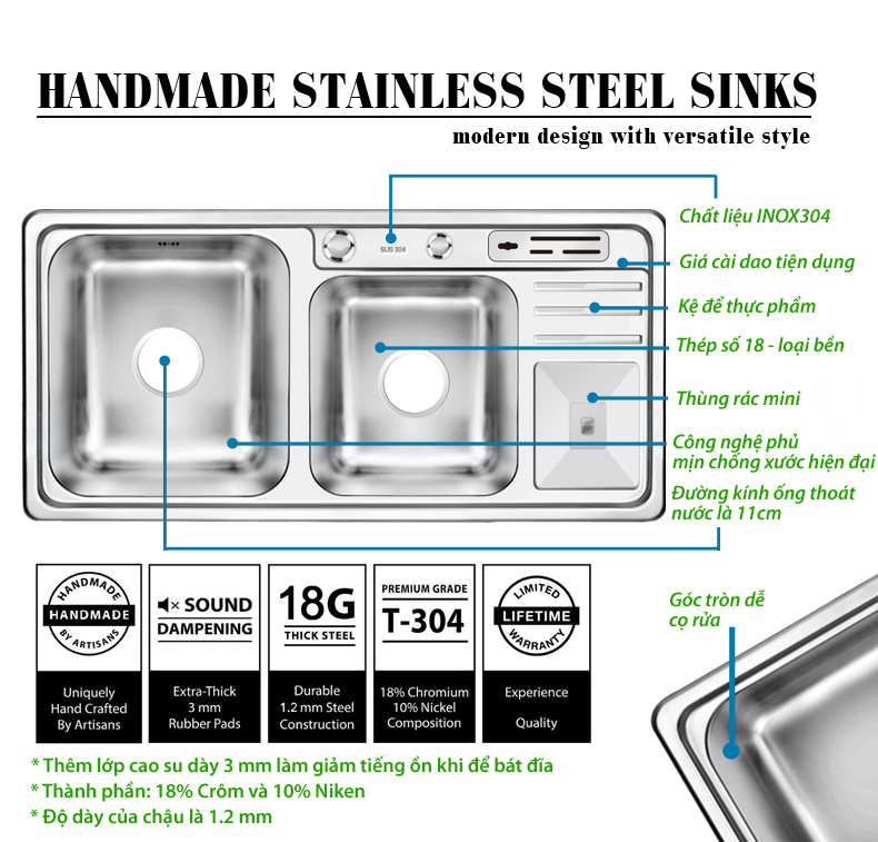 - Chất liệu: INOX304 cao cấp. - Độ dày: 0,8mm. - Công nghệ phủ: Công nghệ phủ bề mặt: Kỹ thuật phủ mịn, phủ 3 lớp kim loại nguyên chất. Lớp phủ bề mặt tốt hay không có ảnh hưởng trực tiếp đến việc chống bám dính vết mỡ của chậu rửa bát. Vì thế với kỹ thuật phủ mịn 3 lớp kim loại bề mặt chậu luôn sáng bóng chống bụi bẩn, chống dầu mỡ bám dính đến 78%. - Thùng rác tiện dụng đi kèm chậu rửa bát: cắt gọt, dọn dẹp tiện lợi nhanh chóng, sạch sẽ, là phương án tối ưu nhất xử lý rác mỗi lần làm bếp. - Mỗi bên chậu được gia cố thêm miếng đệm cao su dày 3mm dùng để cách âm. - Chậu rửa bát được thiết kế dài, sâu khác biệt so với bồn rửa thông thường, để được nhiều vật dụng như xoong, chảo, nồi cỡ lớn. - Sản xuất trên dây chuyền công nghệ CHLB Đức - SUS 304, Sử dụng kỹ thuật tán mịn, phủ quang bề mặt inox chống ăn mòn, chống gỉ sét, không nhiễm từ, sáng bóng, đảm bảo độ bền cao. |