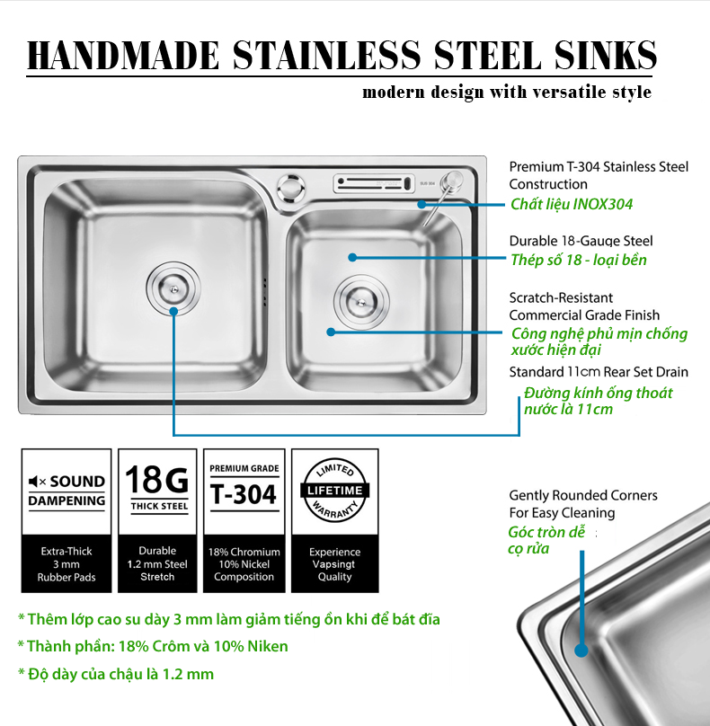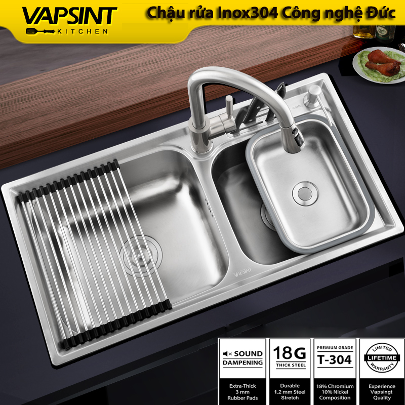 - Chất liệu: INOX SUS 304 cao cấp. - Độ dày: từ 0,8 ~ 1.2mm. - Công nghệ: Sử dụng công nghệ tiên tiến của ĐỨC SIL VINOX - Phủ Inox sợi mịn hoàn hảo, chống ăn mòn, chống bám dầu, dễ rửa sạch. - Bề mặt phủ: 3 lớp - Thiết kế 2 hố, đáy sâu, chiều ngang rộng chứa được nhiều vật dụng và sử dụng đa năng - Mỗi bên chậu được gia cố thêm miếng đệm cao su dày 3mm dùng để cách âm. - Bề mặt lòng chậu được thiết kế với 4 rãnh giúp xả nước nhanh hơn và sạch sẽ hơn so với chậu thông thường. - Vòi rửa bát đa năng, kéo dài, tắt mở nước bằng nút bấm - Kèm theo chậu rửa hoa quả nhỏ - riêng biệt với 2 bồn rửa - giữ gìn vệ sinh an toàn thực phẩm |