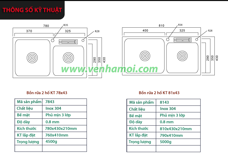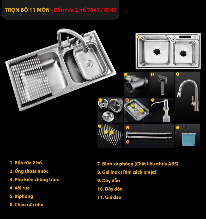- Chậu được chia làm 02 loại: tùy thuộc vào kích thước. + Loại 7843: Kích thước 78x43cm - trọn bộ 11 món + Loại 8143: Kích thước 81x43cm - trọn bộ 11 món - Vòi rửa bát kèm theo trong sản phẩm này có model: VNM-VQY016 (Click xem thông tin chi tiết) |