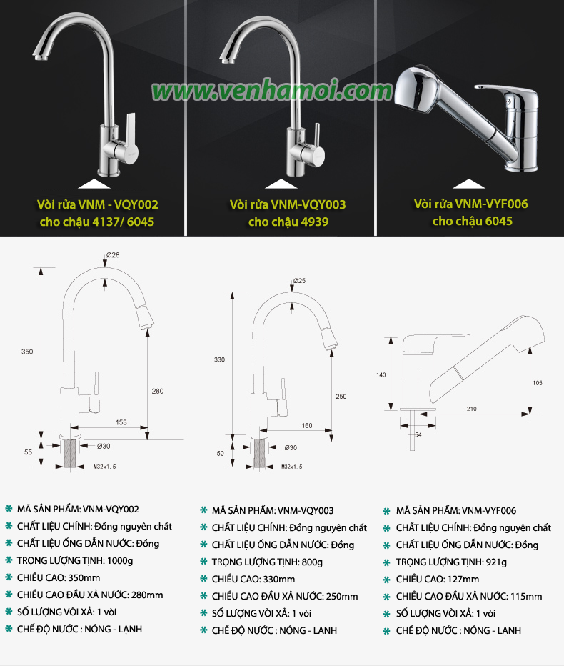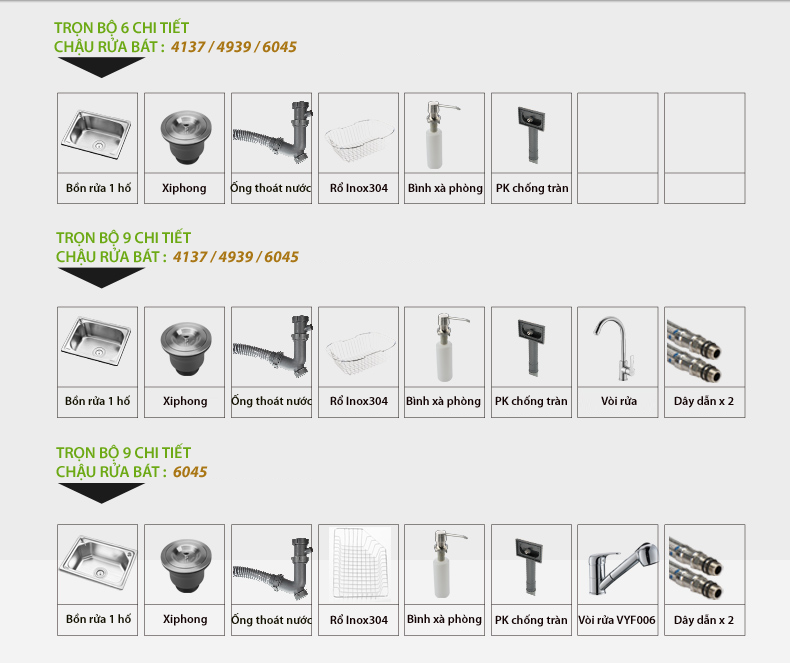- Chậu được chia làm 07 loại: tùy thuộc vào kích thước và kèm vòi rửa bát. + Loại 4137: Kích thước 41x37cm, trọn bộ 6 phụ kiện, không kèm vòi rửa bát + Loại 4137: Kích thước 41x37cm, trọn bộ 9 phụ kiện, Kèm vòi rửa bát VNM-VQY002 (kiểu cao) + Loại 4939: Kích thước 49x39cm, trọn bộ 6 phụ kiện, Không kèm vòi rửa bát + Loại 4939: Kích thước 49x39cm, trọn bộ 9 phụ kiện, Kèm vòi rửa bát VNM-VQY003 (kiểu cao) + Loại 6045: Kích thước 60x45cm, trọn bộ 6 phụ kiện, Không kèm vòi rửa + Loại 6045: Kích thước 60x45cm, trọn bộ 9 phụ kiện, Kèm vòi rửa bát VNM-VQY002 (kiểu cao) + Loại 6045: Kích thước 60x45cm, trọn bộ 9 phụ kiện, Kèm vòi rửa bát kéo dài VNM-VYF006 (kiểu thấp)