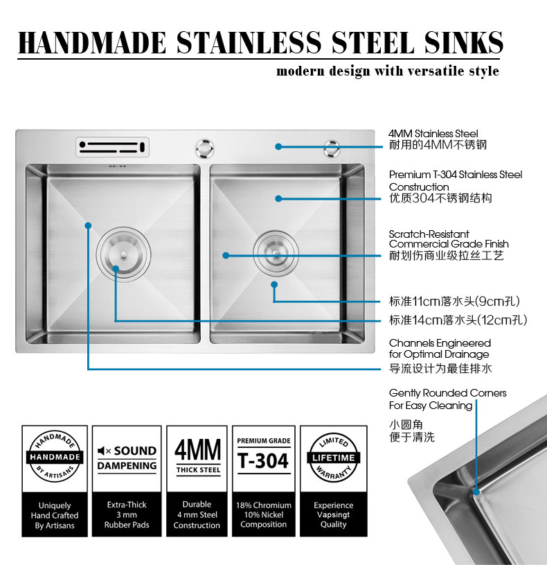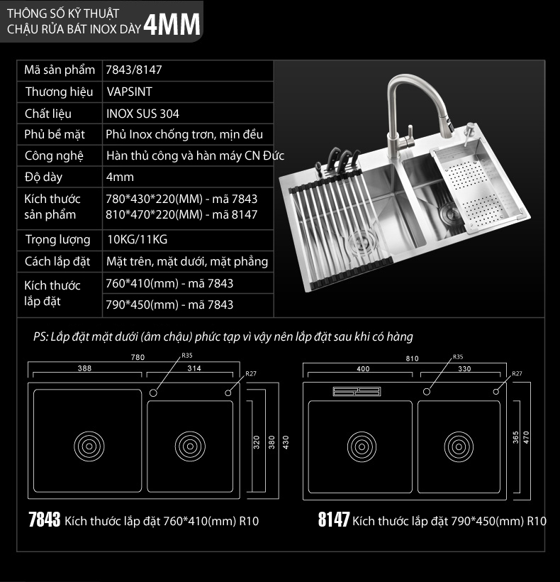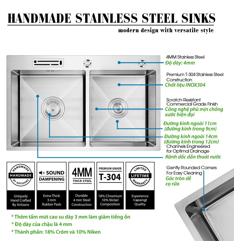 Chậu rửa bát 2 hố Chất liệu INOX SUS 304 bản dày 4mm VNM-voh7843