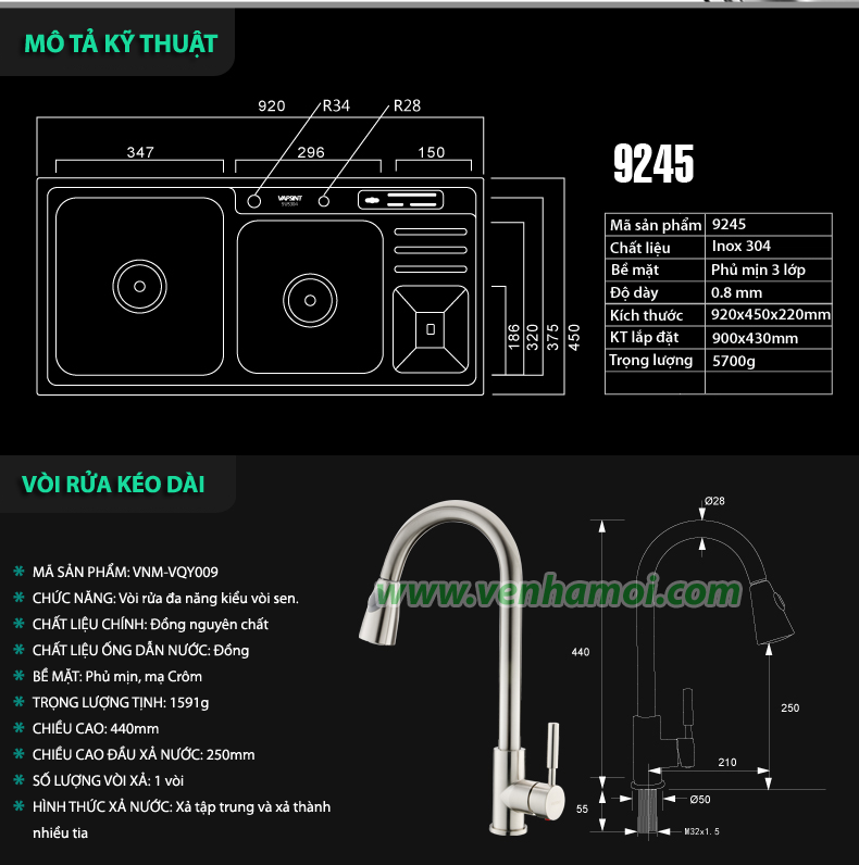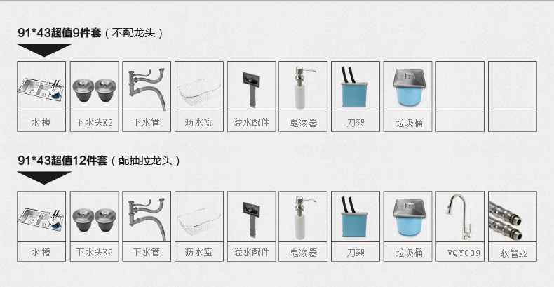 - Chậu được chia làm 04 loại: tùy thuộc vào kích thước và kèm vòi rửa bát. - Các đặc điểm khác nhau: + Loại 9143: Kích thước 91x43cm, trọn bộ 9 phụ kiện, KHÔNG kèm vòi rửa. + Loại 9143: Kích thước 91x43cm, trọn bộ 12 phụ kiện, kèm vòi rửa bát đa năng kéo dài. + Loại 9245: Kích thước 92x45cm, trọn bộ 10 phụ kiện, KHÔNG kèm vòi rửa. + Loại 9245: Kích thước 92x45cm, trọn bộ 13 phụ kiện, kèm vòi rửa bát đa năng kéo dài. - Vòi rửa bát kèm theo trong sản phẩm này có model: VNM-VQY009 (Click xem thông tin chi tiết) |