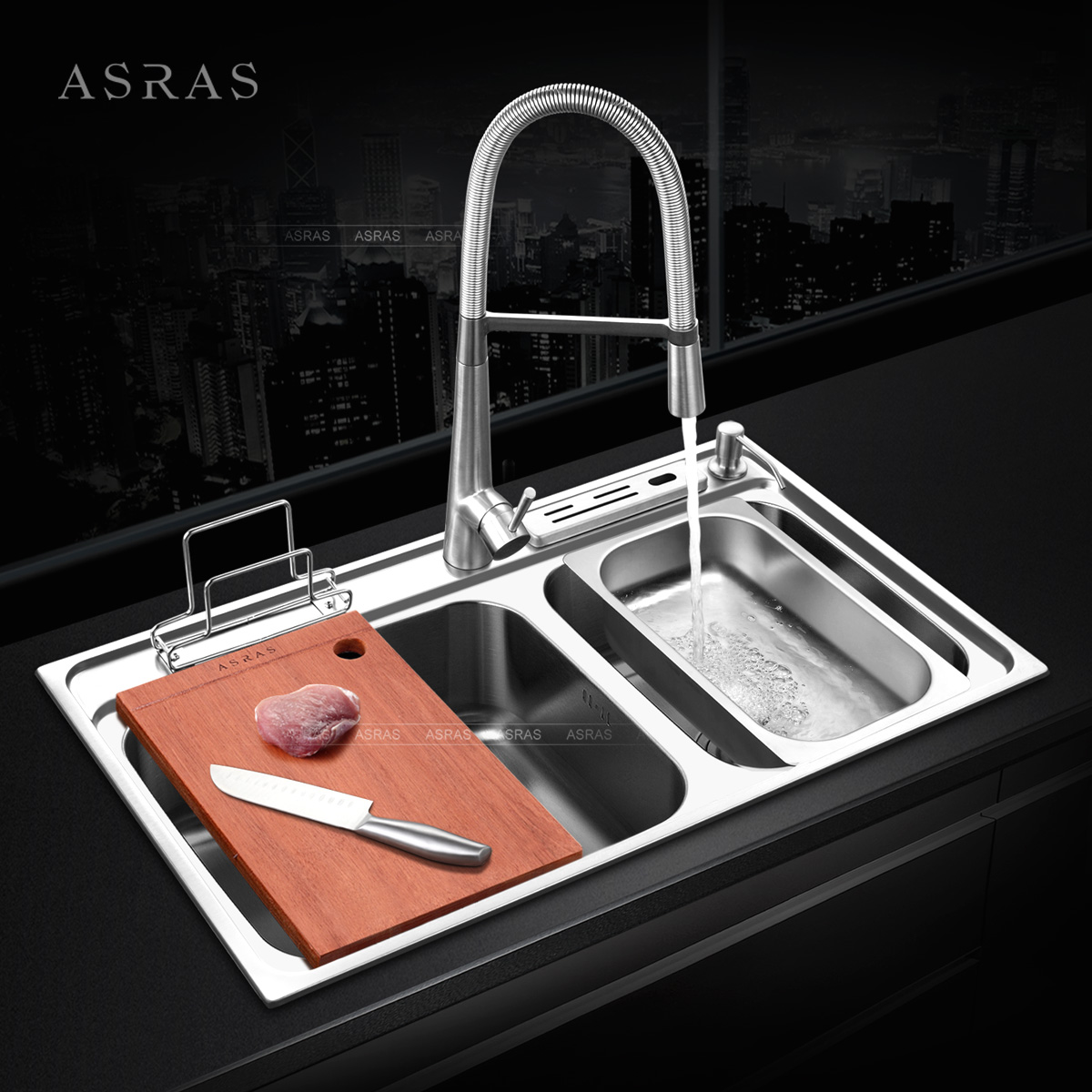 Chậu rửa bát hai hố chất liệu inox SUS304 kèm vòi rửa có dây kéo và khay dao VNM-ARAS-6686