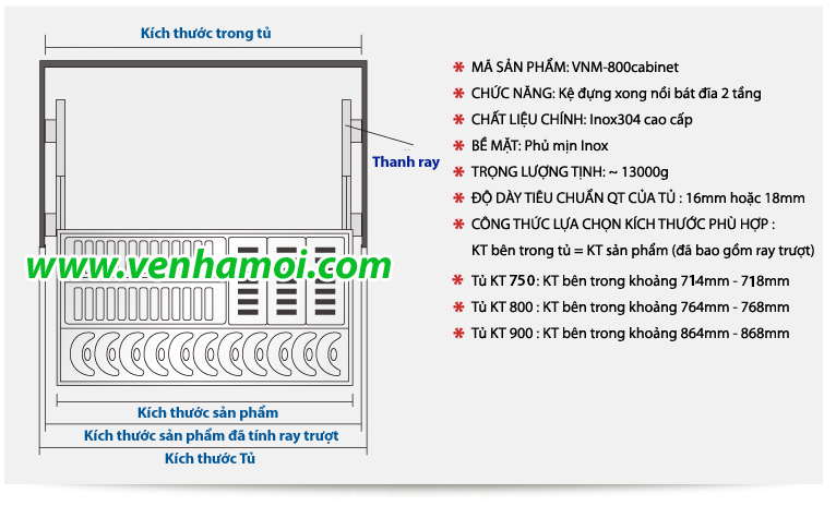 - Kệ được chia làm 02 loại: tùy thuộc vào kích thước : + Loại KT 750 : Kích thước trong khoảng 714mm - 718mm + Loại KT 800 : Kích thước trong khoảng 764mm - 768mm + Loại KT 900 : Kích thước trong khoảng 864mm - 868mm (*) CHÚ Ý : Độ rộng của thanh ray có thể xê dịch trong phạm vi 4mm cho nên Kích thước tủ và Kích thước sản phẩm (kèm thanh ray) thường là có sai lệch trong phạm vi 4mm