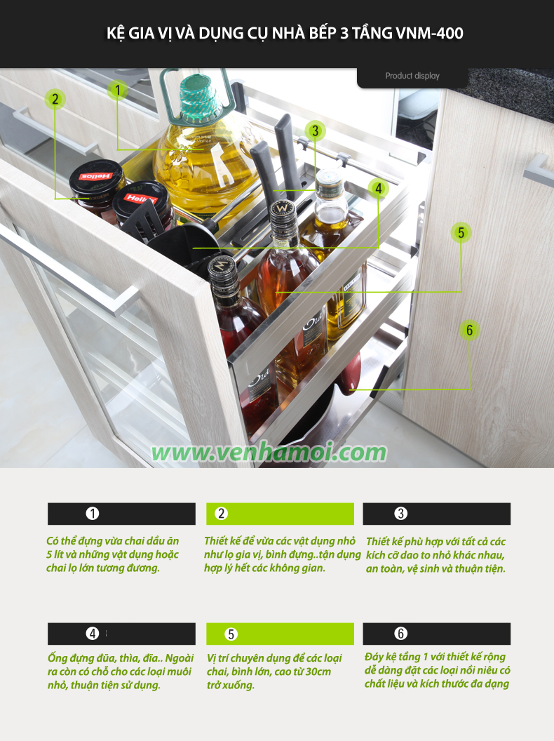 + Loại VNM-400: Kích thước 400mm, Kệ 3 tầng kèm thanh ray giảm chấn